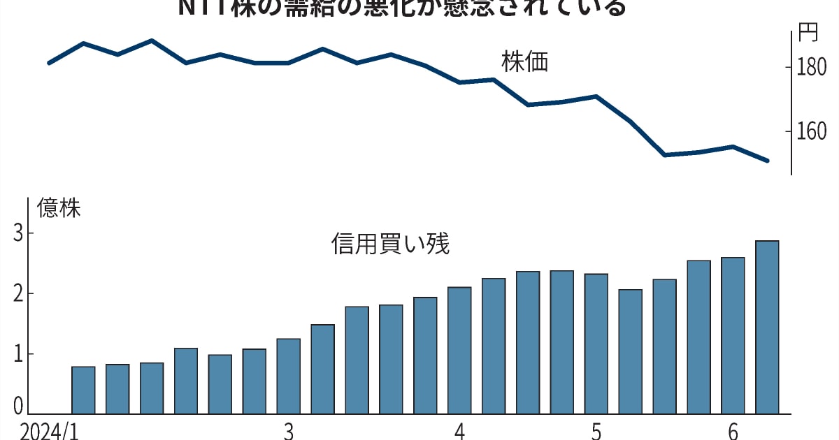 12日の東京株式市場でNTT株が大幅に続落し、前日比2円20銭(1%)安の148円と終値で心理的節目の150円を割り込ん…