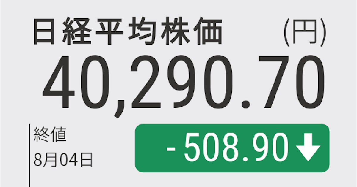 4日の東京株式市場で日経平均株価は続落し、終値は前週末比508円90銭(1.25%)安の4万0290円70銭だった。米景…