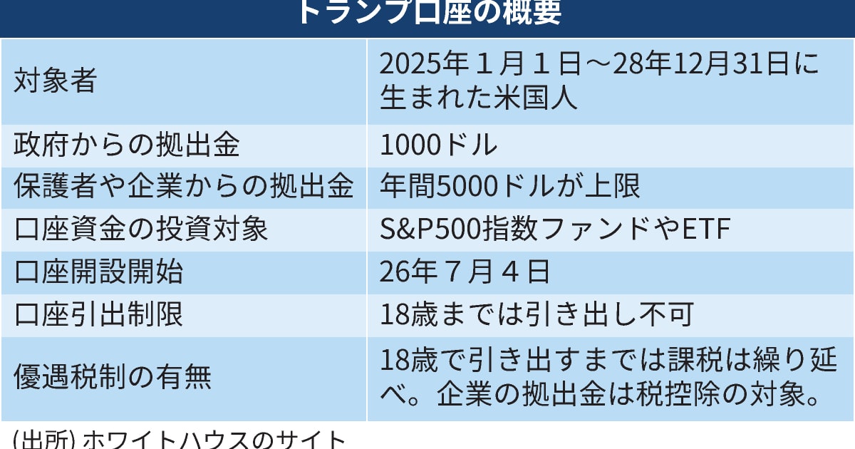 【ニューヨーク=伴百江】米政府は17日、新生児向けの投資口座「トランプ口座」の詳細を発表した。米政府が口座に1000ドル…