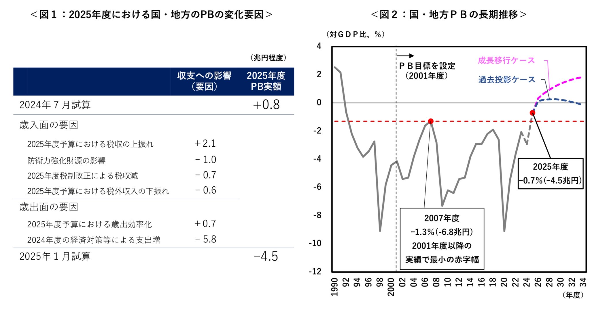 内閣府の資料を見ると、昨年度の補正予算は5.8兆円分PBを悪化させている。他方、国民民主党が主張した103万円の壁の引き上げ等による減税で0.7兆円分悪化しているが、これは税収の上振れ2.1兆円でオフセット(埋め合わせ)されている。