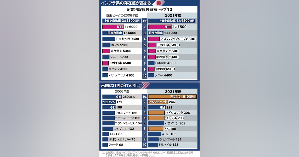 日本企業の設備投資が低迷している。過去最高水準の利益の下でピークに届かず、米欧と比べても伸び悩む。金額のトップ10を集計…